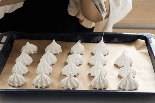 Выложить белковую смесь в кондитерский мешок и отсадить на застеленный силиконовым ковриком или пергаментом противень безе в форме куполов диаметром 3–4 см. Безе должно занять два противня. Выпекать безе около часа в разогретой до 75 градусов духовке в режиме конвекции. Затем поменять противни местами и выпекать еще 60 минут. Выключить духовку и, не вынимая безе, дать ему остыть.