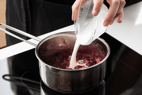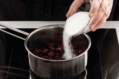 Затем вмешать в вишню крахмал, проварить, помешивая, 1,5–2 минуты, чтобы крахмал заварился. Переложить в миску и остудить.