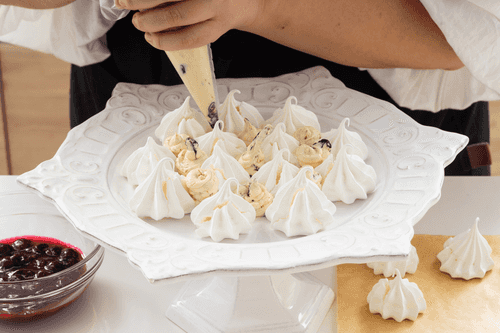 Для сборки торта использовать блюдо диаметром 24–26 см. Смазать блюдо тонким слоем крема, сверху по кругу выложить безе. При помощи кондитерского мешка заполнить пустоты между безе кремом. Затем выложить часть вишни.