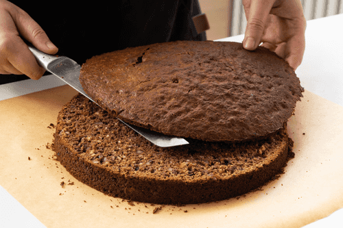 Дать коржу полностью остыть, затем разрезать его вдоль на три равные части.