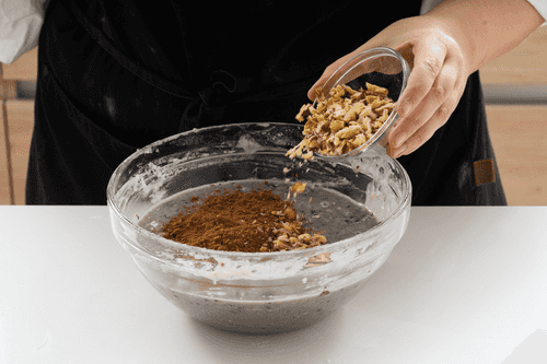 Добавить в тесто измельченные грецкие орехи (50 г) и 2 столовых ложки какао.
