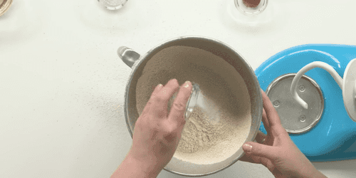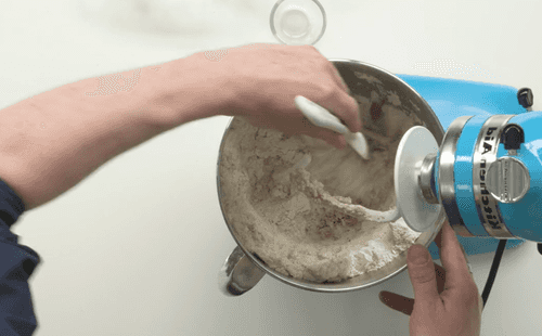 Воду смешать с солью и довести до кипения. Добавить воду в миксер и замесить тесто.