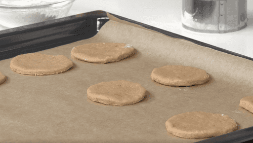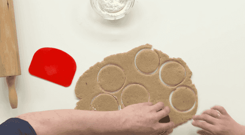 Раскатать тесто толщиной 1 см и вырезать круги диаметром 5 см.