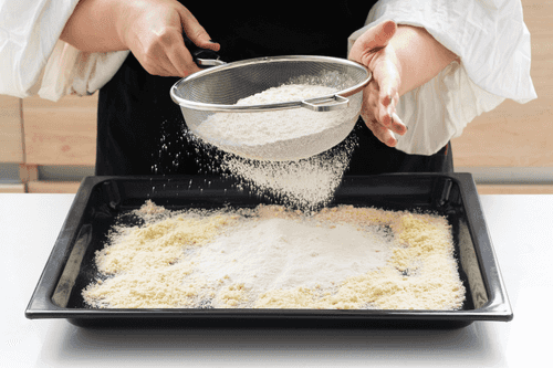 За день до приготовления миндальную и просеянную пшеничную муку распределить на противне и убрать в разогретую до 160 градусов духовку на 45 минут, раз в 10 минут доставая и помешивая. Мука должна стать сухой и слегка потемнеть. Дать полностью остыть и оставить на сутки.