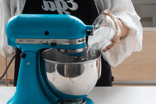 Продолжая взбивать, всыпать в него тонкой струйкой сахарную пудру.