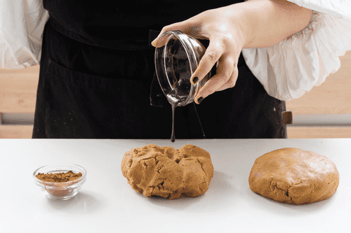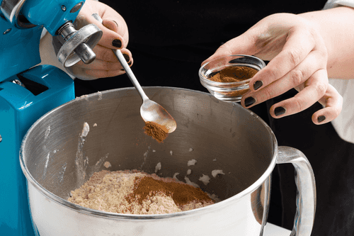 Затем всыпать муку и корицу. Замесить тесто.