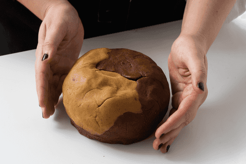 Скатать обе части в шар, обернуть пленкой и убрать на час в холодильник.