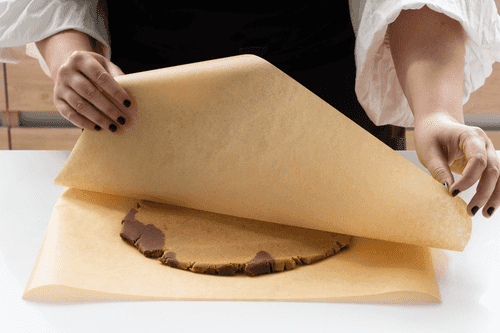 Тесто вынуть. Выложить между двумя листами бумаги для выпечки и раскатать до толщины 1–1,5 см.