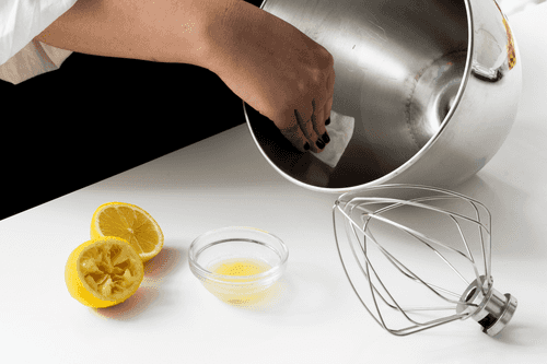 Обмакнуть ватный диск в лимонный сок, смазать им стенки дежи миксера и венчик.