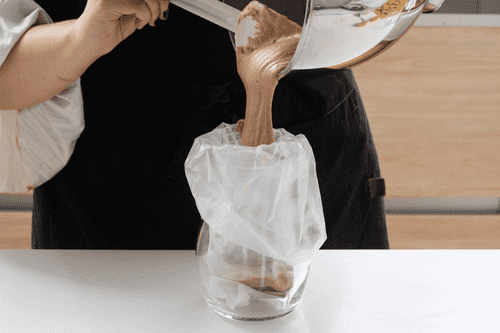 Застелить противень пергаментом. Переложить массу в кондитерский мешок.