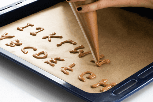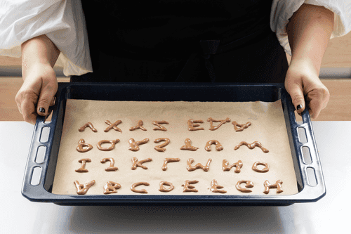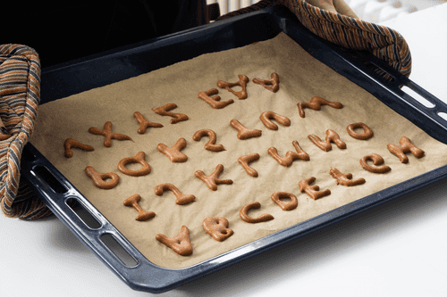 Вывести на противне печенья в виде букв алфавита. Оставить на 15 минут при комнатной температуре.