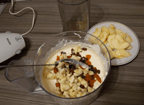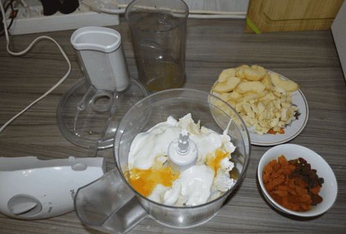 Удалить ножи из блендера. Выложить изюм, банан и порезанную курагу в творожную смесь. Размешать ложкой (но не толочь!). Банан должен остаться кусочками.