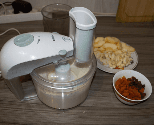 Измельчить смесь в блендере. Изюм и курагу вымыть и высушить на полотенце. Банан очистить и нарезать небольшими кусочками. Яблоко очистить от кожуры и семян и нарезать узкими дольками. Курагу порезать небольшими кусочками (удобно ножницами).