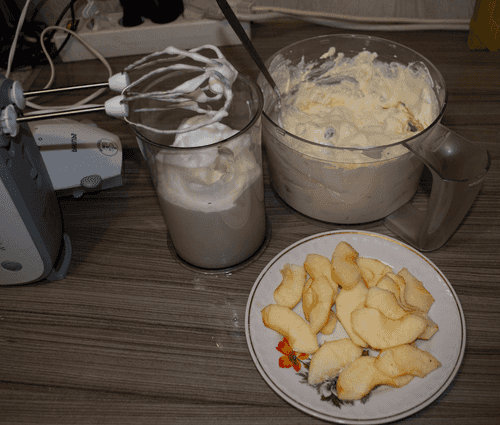 Взбить белки до крутых пиков миксером в отдельной посуде.