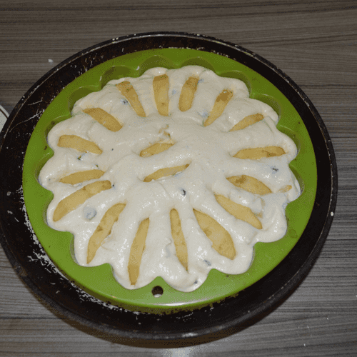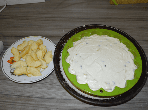 Распределить дольки яблок, погружая их в тесто до упора. Можно любым рисунком, но в виде солнышка удобнее потом разрезать.