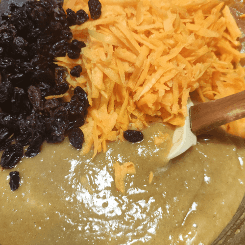 Добавить морковь и изюм в тесто и снова перемешать.