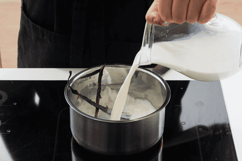 Разрезать ванильный стручок вдоль. Ножом удалить семена, отложить их в сторону.