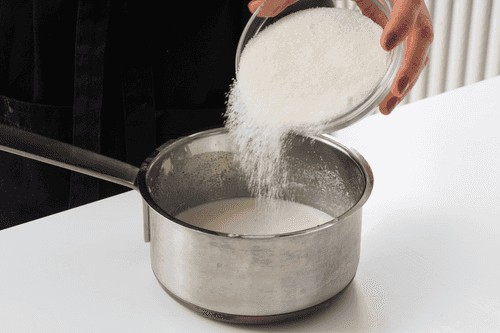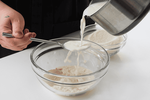 Смешать дрожжи, 2 столовых ложки муки, 1 столовую ложку сахара и 3 столовых ложки ванильного молока. Накрыть смесь пленкой, оставить на 10–15 минут в теплом месте.