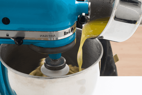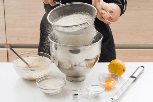 Просеять муку в дежу миксера. Добавить дрожжевую смесь, желтки, семена ванили, цедру 1 лимона и соль.