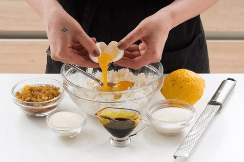 Пробить творог погружным блендером, смешать с 2 яйцами, манкой, изюмом, 75 граммами сахара, цедрой 1 лимона и экстрактом ванили.