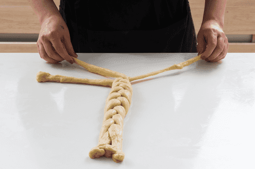 Из одной половины сформировать три колбаски длиной 40 см. Заплести из колбасок косичку.