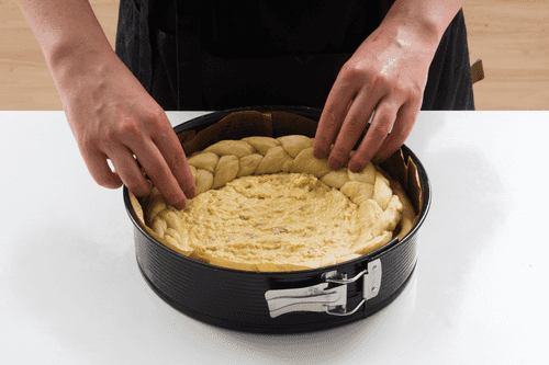 Вылить внутрь начинку. Положить косичку на форму с тестом.