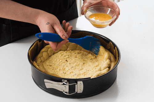 Смазать сливочным маслом разъемную форму 26 см, застелить пекарской бумагой. Распределить оставшееся тесто по дну и стенкам формы. Проткнуть тесто по периметру вилкой.