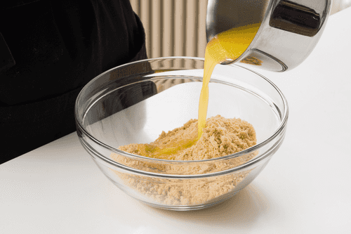 В миске перемешать орехи и печенье. Залить растопленным маслом и вымесить до состояния влажной крошки.