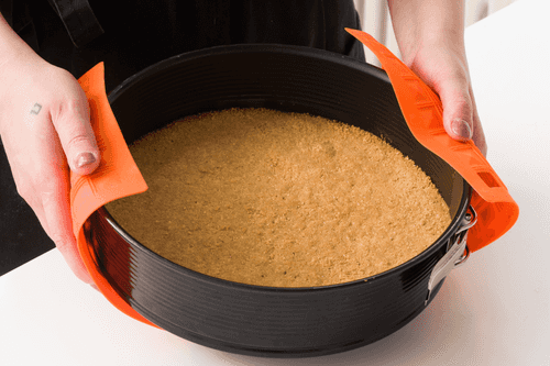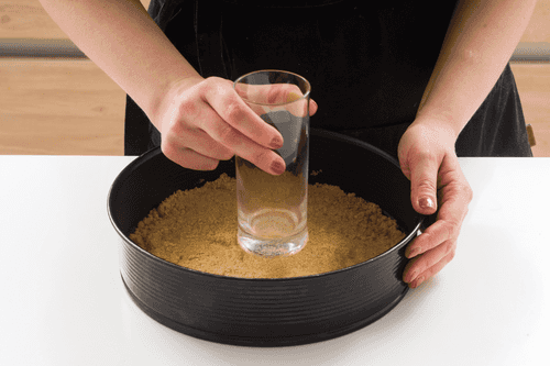 Застелить разъемную форму диаметром 24 см пергаментом, выложить в нее крошку и прокатать стаканом, чтобы получился ровный плотный корж.