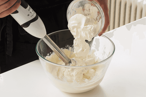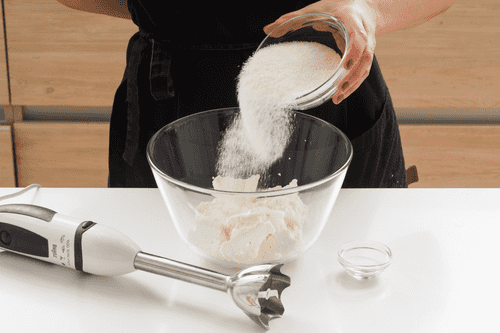 Приготовить начинку. Творог вместе с 200 граммами сахара и ванильным сахаром взбить блендером до однородной, гладкой консистенции. Сахар должен полностью раствориться.