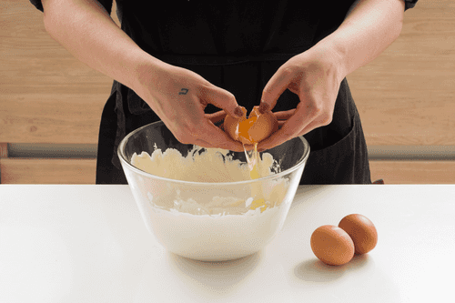 По одному вмешать яйца, чтобы масса была однородной, но не взбивать ее слишком сильно.