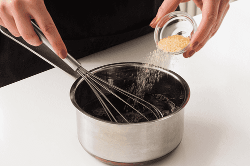 Добавить 100 грамм сахара, поставить смесь на плиту и нагреть до 60 градусов. Снять с огня и размешать, чтобы желатин полностью растворился. Если остались комочки, пропустить смесь через мелкое сито. Дать желатиновой смеси остыть, не давая застыть.