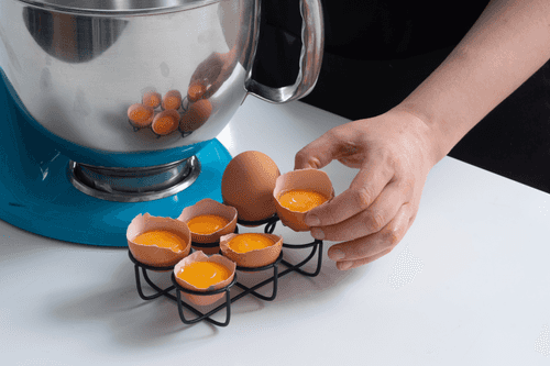 Яйца разделить на желтки и белки. Белки влить в чашу миксера, а желтки оставить целыми — удобно это сделать, если оставить каждый желток в своей половине скорлупы.