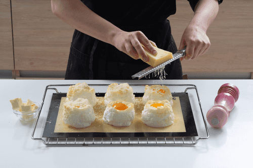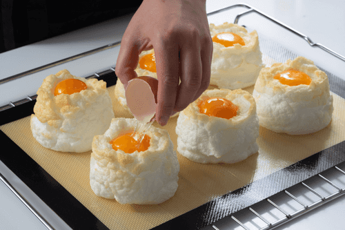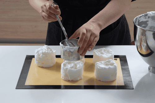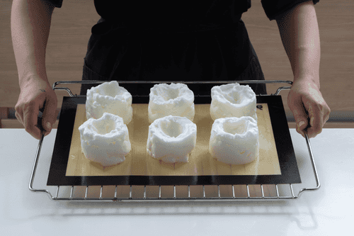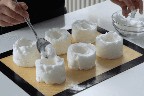 6 небольших неглубоких формочек (это могут быть порционные формы для жюльена) смазать маслом и аккуратно заполнить ложкой яичной пеной, стараясь не потерять объема. Если нет формочек, выложить горки пены на расстоянии друг от друга на силиконовый коврик через поварское кольцо.