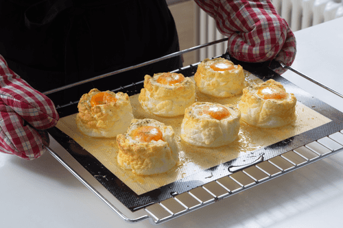 Вернуть формочки в духовку еще на 4–5 минут, пока желтки слегка не схватятся, но внутри желтки должны остаться жидкими, а белки — стать хрустящими.