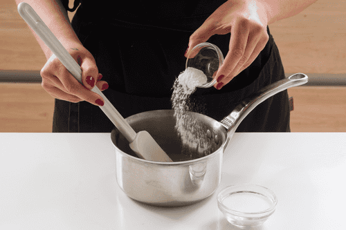 Приготовить молочный сироп. В сотейник всыпать сахар, добавить молоко (40 мл). Поставить на средний огонь и, помешивая лопаткой, дождаться растворения сахара.