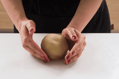 Переложить тесто на припыленную мукой поверхность и собрать руками в комок.