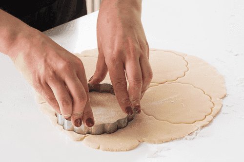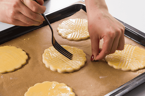Вырезать при помощи круглой формы коржики (форму лучше тоже припылить мукой, тесто достаточно липкое) и при помощи лопатки переложить их на застеленный пергаментом противень.