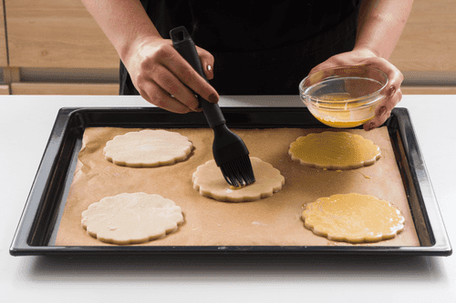 Смешать оставшееся молоко с желтком и смазать поверхность коржиков.