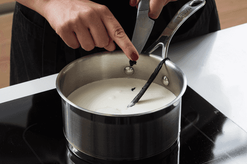 Сливки вскипятить вместе со стручком, семенами ванили и 100 граммами сахара. Дать немного остыть, затем вынуть стручок.