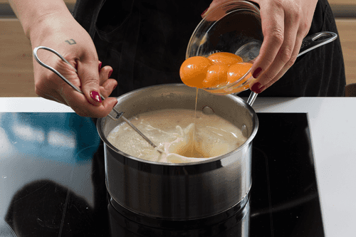 Добавить желтки (чтобы желтки не заварились, температура сливок не должна превышать 45 градусов), поставить на огонь и, постоянно помешивая венчиком, довести до густоты жирной сметаны.
