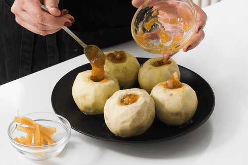 В каждое яблоко выложить по ложечке мармелада и лимонные цукаты.