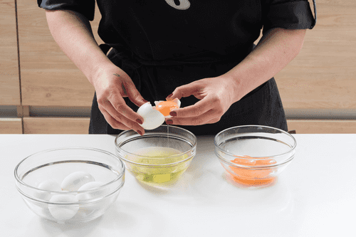 Выложить взбитые белки к желткам и перемешать лопаткой, двигаясь снизу вверх.