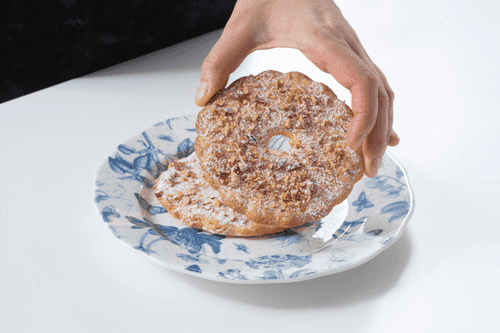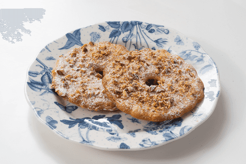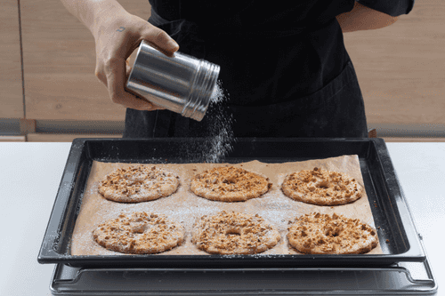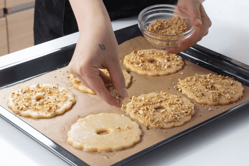 Посыпать кольца рубленым миндалем или орехами и поставить в духовой шкаф при температуре 180 градусов на 10–15 минут для выпечки.