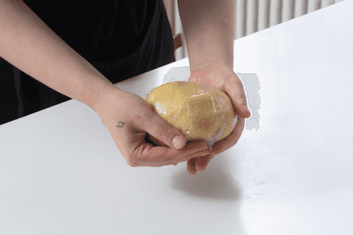 Скатать тесто в шар, накрыть и дать ему полежать в прохладном месте от 30 минут до часа.