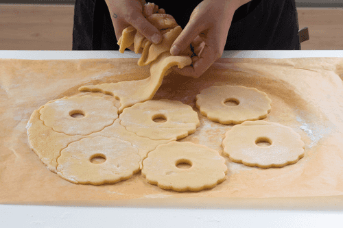 Готовое тесто раскатать толщиной ½ см, вырезать кружки — стаканом или специальной выемкой. В центре каждого кружка вырезать и вынуть маленький кружочек.