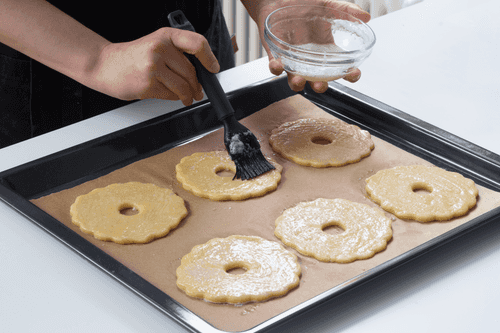 Полученные кольца положить на лист, смазать взбитым яичным белком.