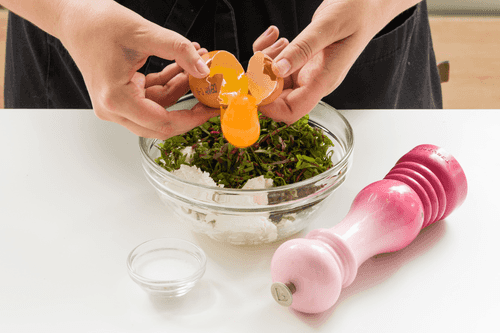 Творог (он должен быть очень сухим, иначе его придется отвесить на марле) смешать с зеленью и яйцом. Посолить, поперчить.
