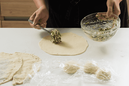 Предлагаем вам уникальный рецепт женгялов-хац, который в переводе с армянского означает «лепешка с зеленью». Это блюдо традиционно готовят в горных районах, используя более 40 различных трав. Хотя в нашем саду не такой богатый ассортимент, даже с обычной зеленью, произрастающей в средней полосе, результат оказался прекрасным. Примечание: такие лепешки особенно вкусны в сочетании с кисломолочными продуктами. Вы можете подать их с мацони или использовать творог в качестве начинки — мы выбрали именно второй вариант.