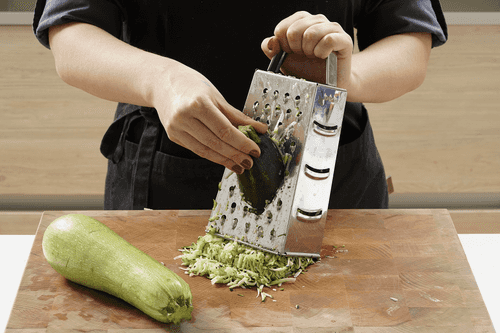 Кабачок и цукини вымыть. Если они молодые, то очищать не надо. Если старые — то лучше снять кожу и вырезать семена. Натереть кабачок и цукини на крупной терке.